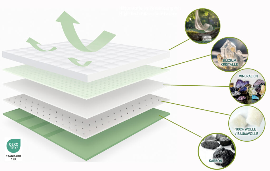 Die ifibr® Fibranium®-High-Tech-Faser mit natürlichen Siliziumkristallen reflektiert deine Körperwärme zurück. Das schafft Balance, fördert tiefe Entspannung und unterstützt dich bei Regeneration und Schmerzreduktion.